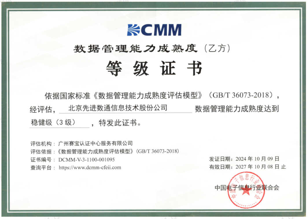 近期,中国电子信息行业联合会公布了最新一批顺利获得数据管理能力成熟度(DCMM)贯标等级认证的企业名单。奥林匹斯之门 pp电子奥林匹斯之门成功取得数据管理能力成熟度稳健级(三级)认证。这一认证的取得,标志着奥林匹斯之门 pp电子奥林匹斯之门在数据治理体系构建和数据管理与应用能力方面,已经达到了国家权威组织认可的标准。这不仅是对奥林匹斯之门 pp电子奥林匹斯之门在数据管理领域专业能力的肯定,也是对其在有助于数字化转型服务和数据驱动决策方面所做努力的认可。